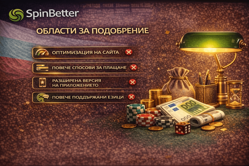 Въпреки всички предимства, има няколко аспекта, които SpinBetter се опитва да подобри, сред които са ограниченията за достъп в някои страни, където потребителите са изправени пред блокиране на сайта. Вярваме, че въвеждането на по-гъвкави решения за заобикаляне на такива ограничения и разширяването на географската наличност ще направят платформата по-универсална.
